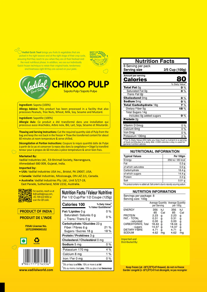 Our premium Chikoo Pulp is made from ripe, succulent chikoos, offering a creamy texture and natural sweetness. Perfect for creating decadent desserts, refreshing beverages, ice creams, and smoothies, it brings a tropical flavor to your kitchen with every serving.