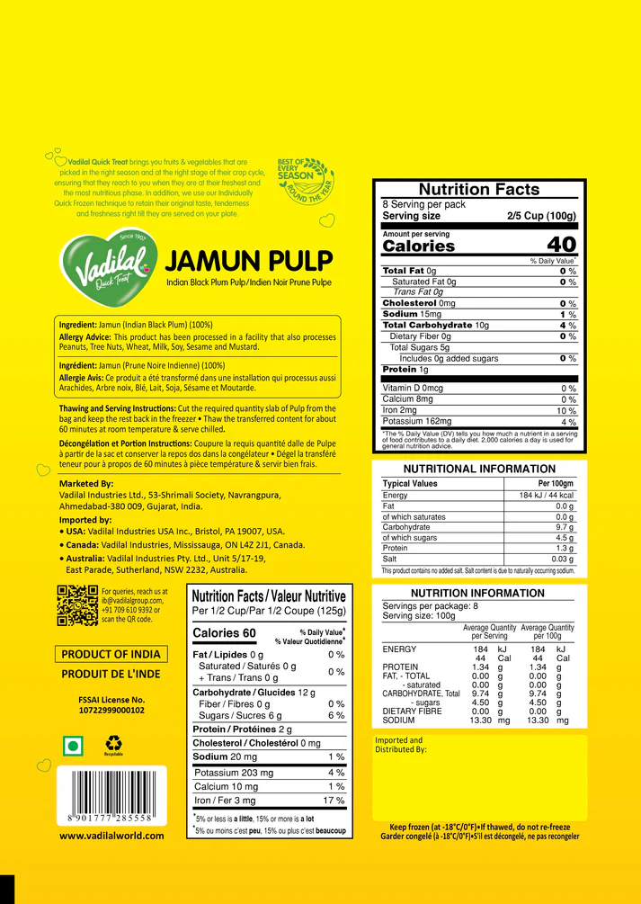Our premium Jamun Pulp is made from ripe, juicy jamuns, delivering a rich and refreshing flavor in every spoonful. Ideal for making beverages, fruit salads, desserts, and jams, this versatile pulp brings a delightful burst of natural sweetness and tang to your culinary creations.