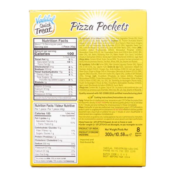 Bring home the delicious taste of cheesy goodness with Vadilal Pizza Pockets 300g, available at Quick Treat. Carefully prepared and packed, these pizza pockets deliver the perfect blend of savory cheese, vegetables, and spices, wrapped in a crispy golden pastry. Enjoy the convenience of having this quick and tasty snack ready in minutes—ideal for satisfying cravings, elevating your meals, or serving as a delightful appetizer for family and friends.