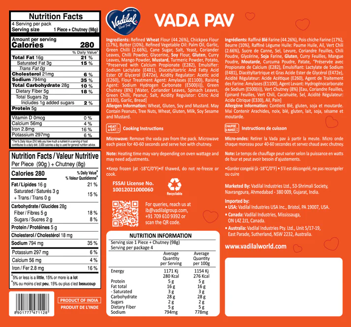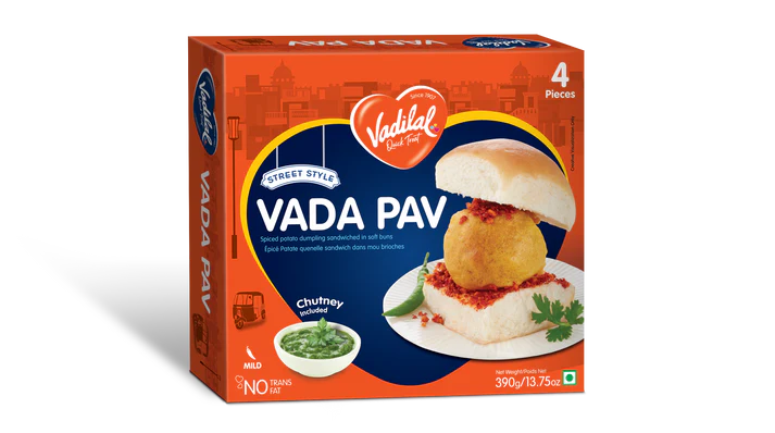 Experience the quintessential street food of Mumbai with Vadilal Vada Pav 90g. A spicy potato fritter (vada) is sandwiched between soft, fresh pav bread and garnished with tangy tamarind and spicy chutneys, delivering a burst of authentic flavors in every bite. Ready to heat and enjoy, this snack is perfect for on-the-go indulgence or a quick, satisfying treat at home.